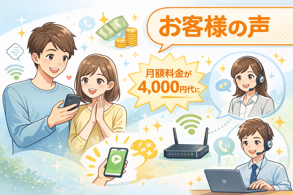 お客様の声お客様の声 2026年2月14日 沖縄県内の集合住宅にお住まいの入居者様より、インターネット回線の切り替え後、以下のようなお声をいただきました。 ■ 沖縄県内 集合住宅にお住まいの入居者様 これまで毎月7,000円近くかかっていたインターネット料金が、4 […]